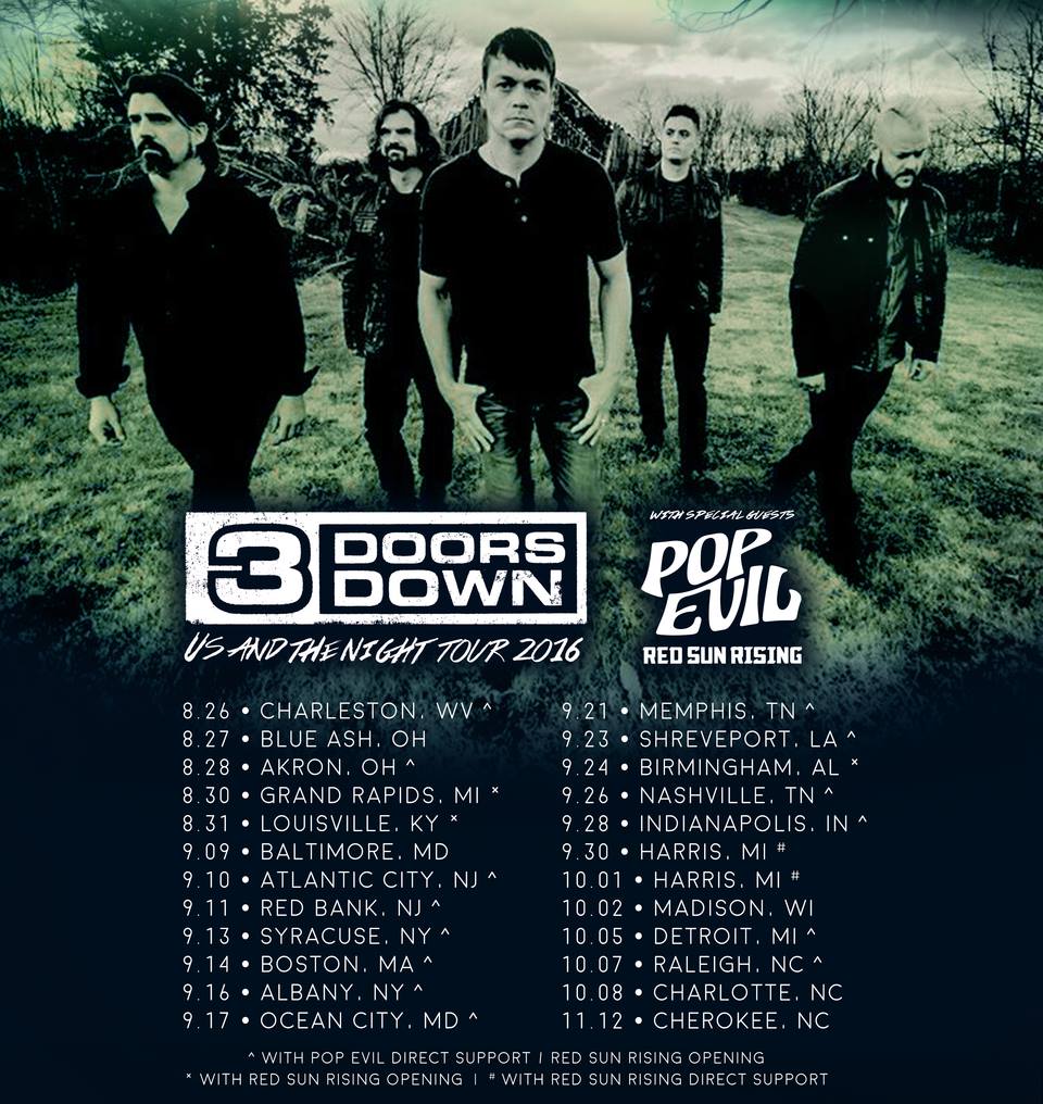 The rock band, 3 Doors Down, has announced a U.S. tour, called the “Us And The Night Tour,” for August through October. This tour is in support of their latest album, Us And The Night. Pop Evil and Red Sun Rising will be on the tour, as support. You can check out the dates, details and poster, after the break.