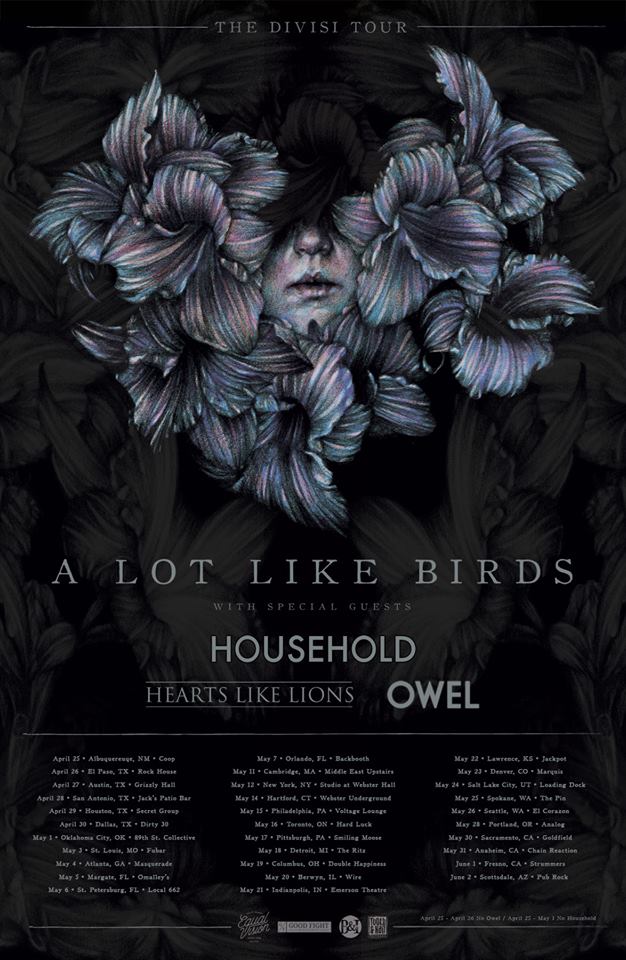 The progressive rock band, A Lot Like Birds, have announced a spring U.S. tour, called “The Divisi Tour,” for April through June. This tour is in support of the band’s forthcoming album, DIVISI. Household, Hearts Like Lions and OWEL will be on the tour, as support. You can check out the dates, details and poster, after the break.