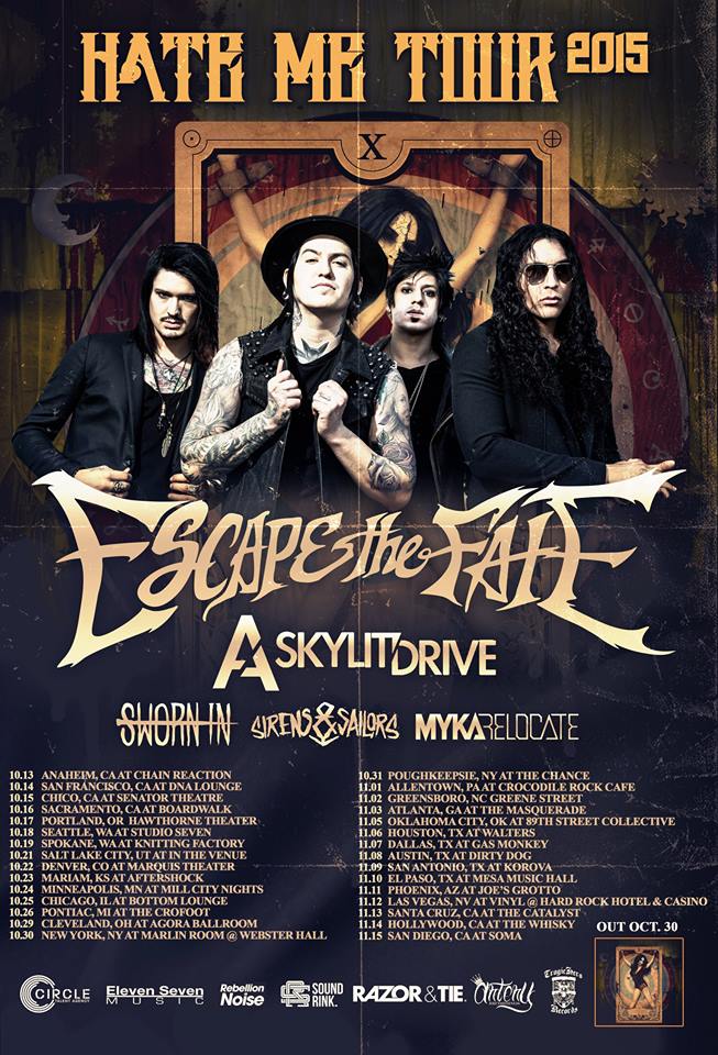 The rock band, Escape the Fate, has announced a headlining U.S. tour, called the “Hate Me Tour,” for this fall. They will be touring in support of their upcoming album, Hate Me. A Skylit Drive, Sworn In, Sirens & Sailors…