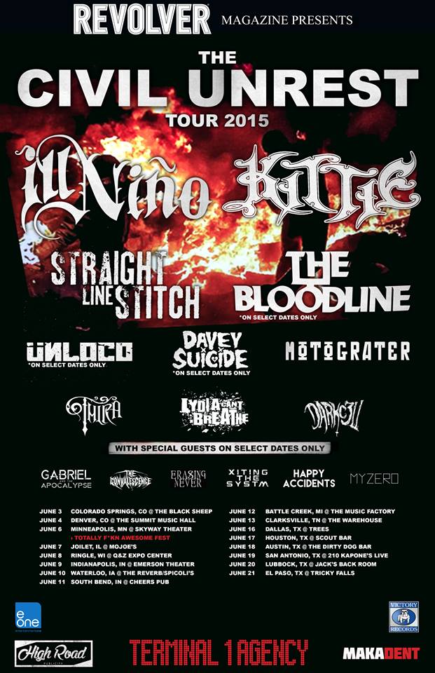 The latin metal band, Ill Nino, has announced a co-headlining tour with Kittie, called “The Civil Unrest Tour,” for this summer. Straight Line Stitch, The Bloodline, Davey Suicide, Motograter, Thira, Lydia Can’t Breathe, Darkc3ll and more, will be on the tour, as support. You can check out the dates and details, after the break.