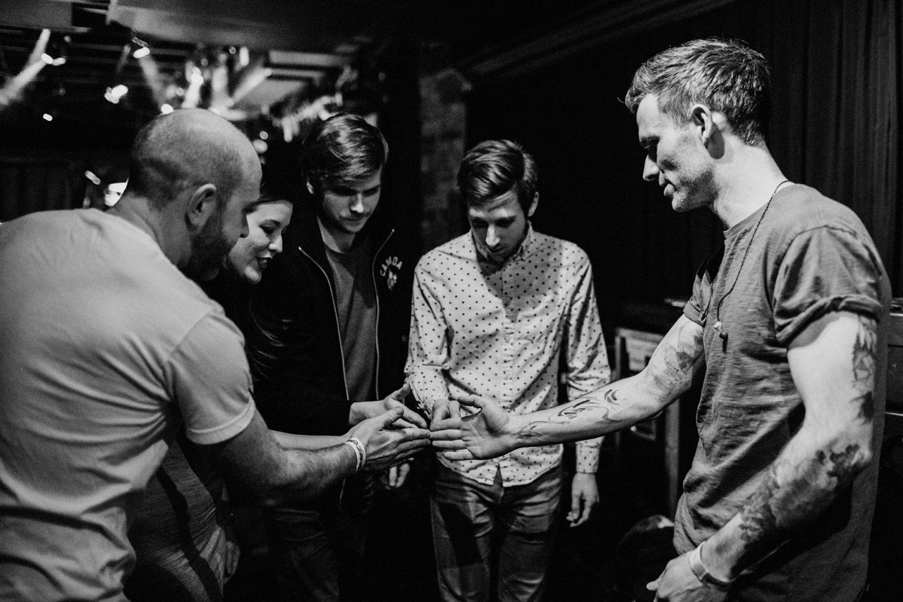 Anyways, it’s called the Cinnamon Roll. It’s basically a “Hip hip hooray” or “Goooo Bayside”-style hands-in cheer. Everyone in the band gathers in a circle, puts their right hand in the middle with fingertips touching (photo below), then rolls their hands counter-clockwise thus creating the cinnamon roll. As the roll tightens, everyone puts their left hand on top, shouts “Cinnamonnnnnnnnn ROLL!” and releases the roll upwards. Then we hit the stage. We’ve been doing this since about 2012 and I don’t think we’ve played a show without the Cinnamon Roll since then.