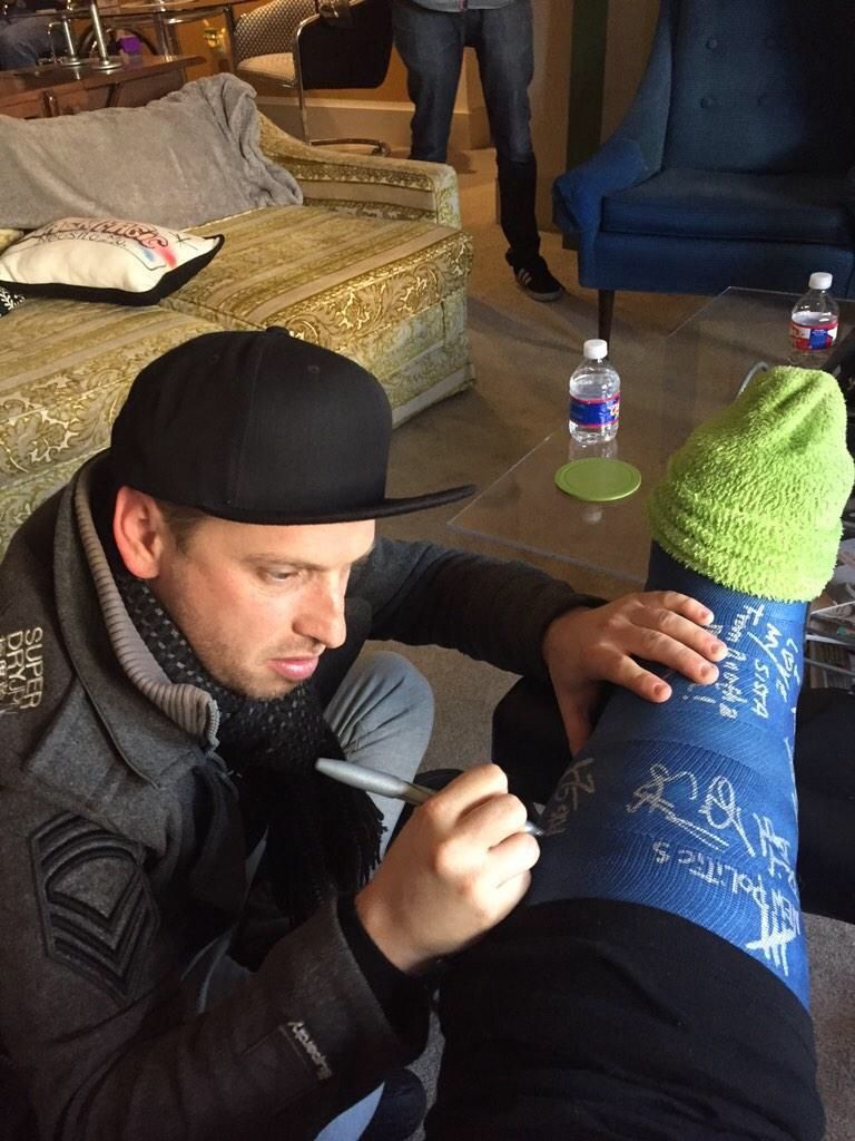 This week started off with a show in Lawrence, KS, but first we went to Kansas City to see our friend and DJ Jeriney for an interview for 96.5 The Buzz. We did our first radio interview way back at SXSW with her, and The Buzz has always supported us so it’s great to go back and see them. This time we had to go to Jeriney’s apartment since she broke her foot recently and couldn’t really walk; which we had no problem because her mom made a bunch of delicious food for us to eat. Here’s a picture of Jordy signing her cast.