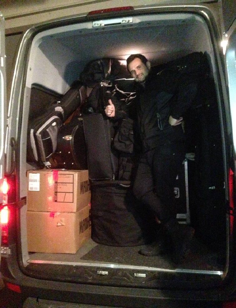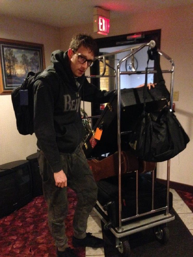 One of the worst parts of touring in the cold, for me, is that I can’t leave my guitars in the van overnight (the cold can damage them). So, I have to carry in all 6 of my guitars AND my luggage every night. This photo pretty much captures my frustration with lugging around all that shit in the cold.