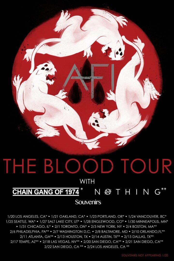 The rock band, AFI, has announced a North American tour, called “The Blood Tour,” for January and February. The Chain Gang of 1974, Souvenirs and Nothing will join the tour, as support. You can check out the dates, details and poster, after the break.