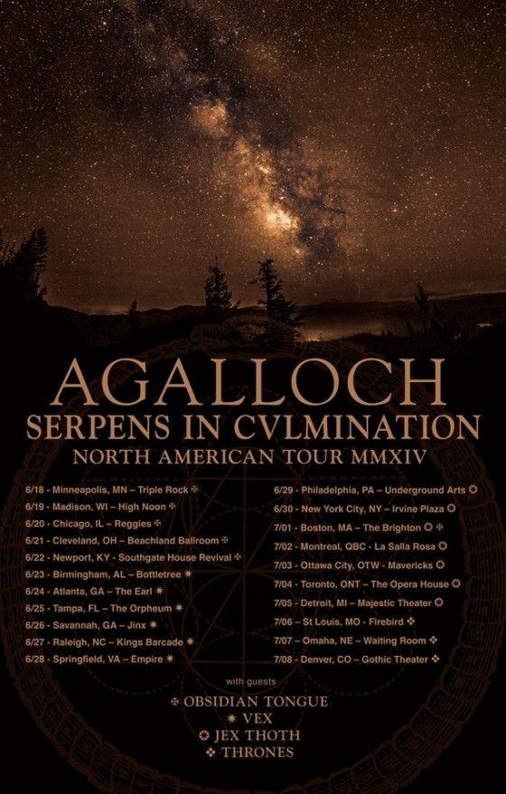 The metal band, Agalloch, has announced the “Serpents in Cvlmination” North American tour in support of their latest release, The Serpent & The Sphere. Obsidian Tongue, Vex, Jex Thoth and Thrones will join the band in select cities. You can check out the dates, details and tour poster, after the break.
