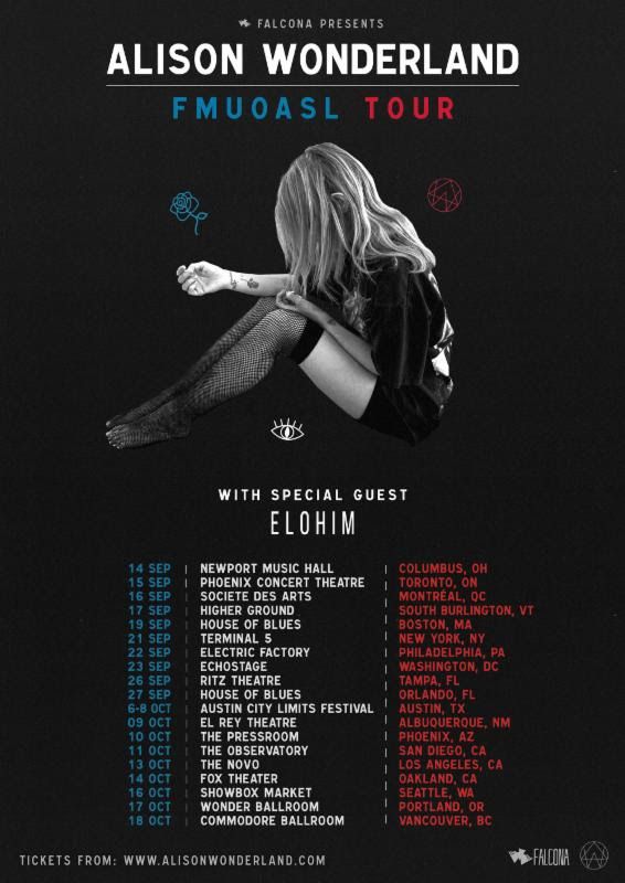 The electronic artist, Alison Wonderland, has announced a North American tour, called the “FMUOASL (Fuck Me Up on a Spiritual Level) Tour”, for September and October. Elohim will join the tour, as support.