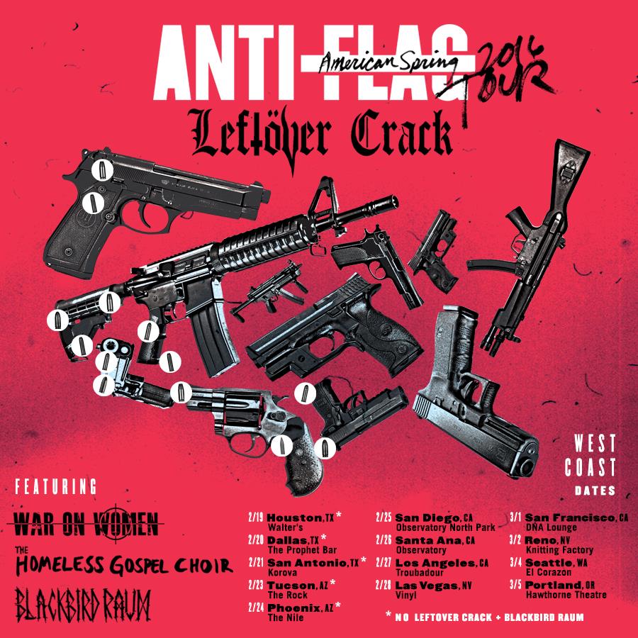 The rock band, Anti Flag, have announced a U.S. tour, called the “American Spring 2016 Tour,” to support their new album, American Spring. Leftover Crack, War On Women, The Homeless Gospel Choir and Blackbird Raum will be supporting the tour….