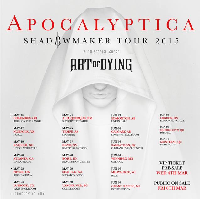 The rock band, Apocalyptica, has announced a North American tour, called the “Shadowmaker Tour 2015,” for this summer. They will be touring in support of their upcoming album, Shadowmaker. Art Of Dying will be joining the tour, as support. You…