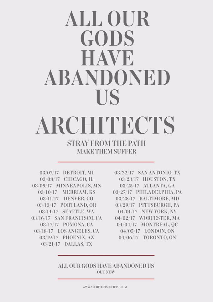 The metal band, Architects, have announced a spring North American tour, called the “All Gods Have Abandoned Us Tour,” for March and April. The tour will be in support of their latest album, All Gods Have Abandoned Us. Stray From The Path and Make Them Suffer will be joining the tour, as support. You can check out the dates, details and poster, after the break.