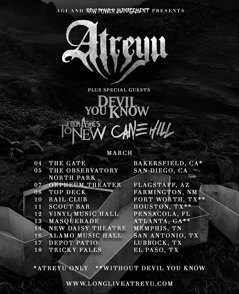 The heavy metal band, Atreyu, have announced a winter U.S. headline tour, for March. Devil You Know (select dates), From Ashes To New and Cane Hill will be on the tour, as support. You can check out the dates, details and poster, after the break.