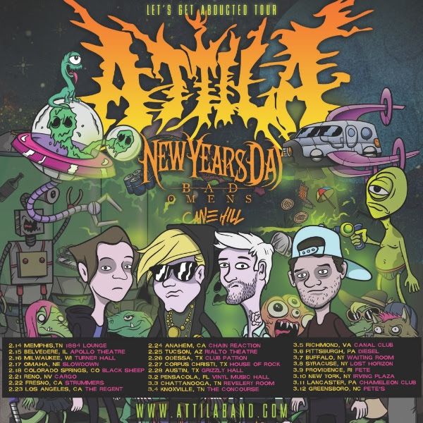 The metalcore band, Attila, has announced a U.S. tour, called the “Let’s Get Abducted Tour,” for February and March. This tour is in support of the band’s latest album, Chaos. New Years Day, Bad Omens and Cane Hill will join the tour, as support. You can check out the dates, details and poster, after the break.