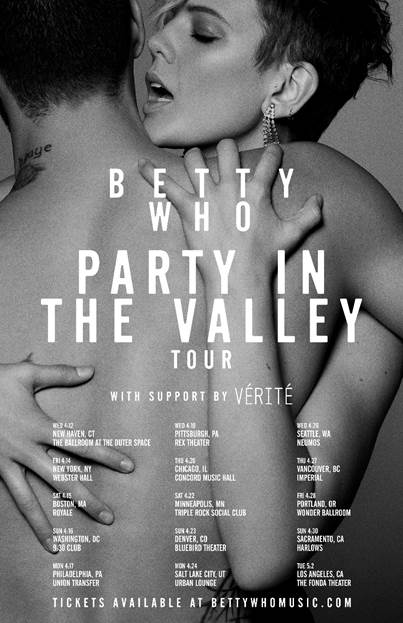 The pop artist, Betty Who, has announced a North American tour, called the “Party In The Valley Tour,” for April. She will be touring in support of her upcoming album, The Valley. VÉRITÉ will join the tour, as support. You can check out the dates, details and poster, after the break.