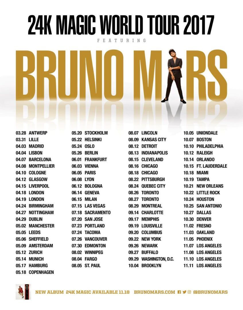 The R&B/pop artist, Bruno Mars, has announced the North American and European dates for his “24K Magic World Tour,” for March through November. This tour is in support of his latest album, 24K Magic. You can check out the dates, details and poster, after the break.