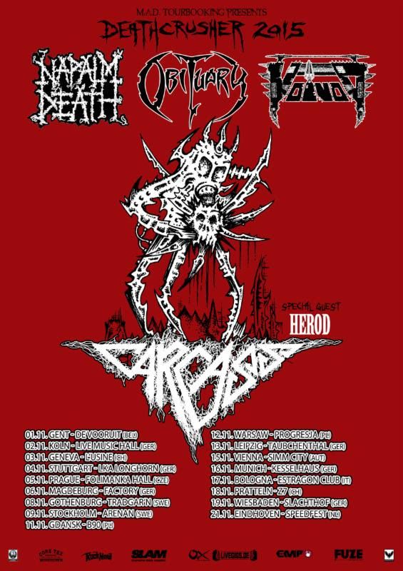 The death metal band, Carcass, have announced a European headline tour, called the “Deathcrusher Tour,” for November. Napalm Death, Obituary, Voivod and Herod will all be on the tour, as support. You can check out the dates, details and poster after the break.
