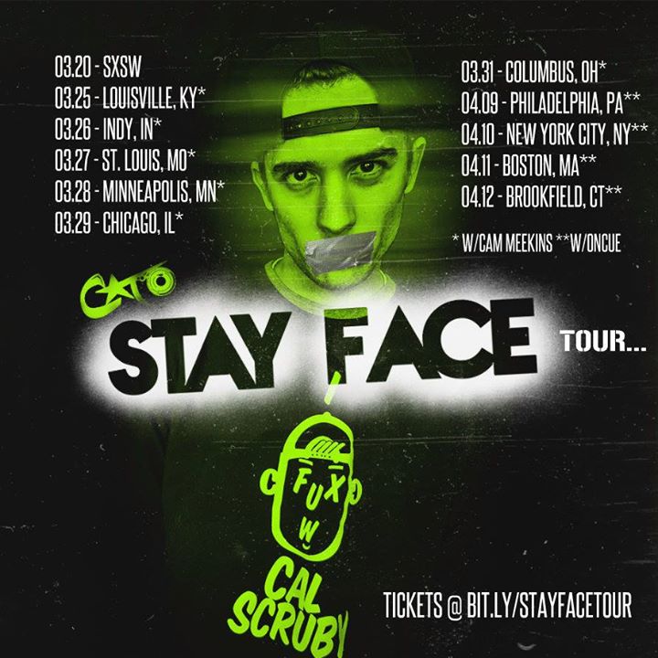 The rap/hip-hop artist, Cato, has announced the U.S. “Stay Face Tour,” for this spring, starting with a performance at SXSW. Cam Meekins and OnCue will each be on select dates of the tour. You can check out the dates, details and poster, after the break.