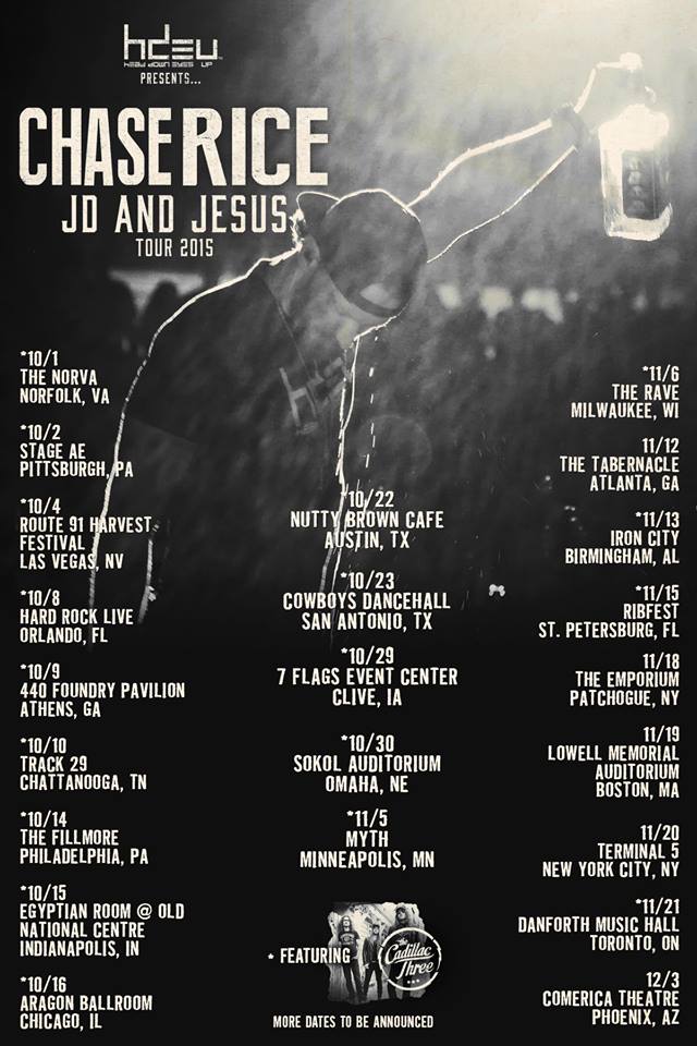 The country music artist, Chase Rice, has announced a fall tour in the United States, called the “JD and Jesus Tour.” The Cadillac Three will be joining the tour, as support. You can check out the dates, details and poster, after the break.