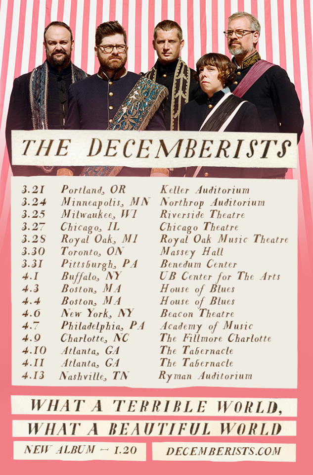 The alternative rock band, The Decemberists, have announced the first leg of their spring tour, in the United States. They will be supporting their upcoming album, What A Terrible World, What A Beautiful World. You can check out the dates, details and poster, after the break.