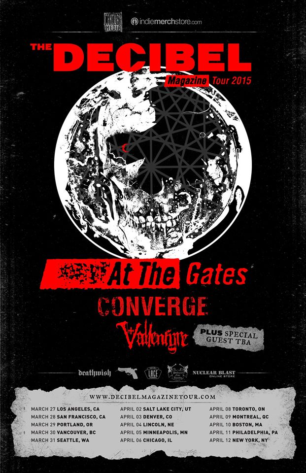 The metal band, At The Gates, have announced that they will be headlining the fourth annual “Decibel Magazine Tour,” in spring of 2015. Joining them will be Converge and Vallenfyre, as well as one yet to be announced band. You can check out the dates, details and poster, after the break.