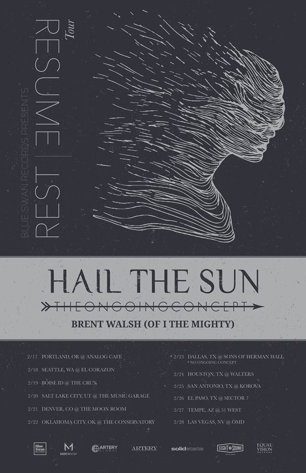 The progressive post-hardcore, Hail The Sun, has announced a U.S. tour, called the “Rest/Resume Tour,” for this February. The Ongoing Concept and Brent Walsh (of I The Mighty) will be joining the tour, as support. You can check out the dates, details and poster, after the break.