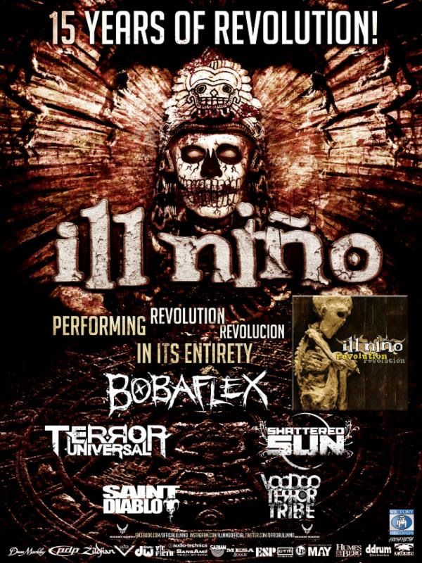 The latin metal band, Ill Niño, have announced a U.S. tour, to celebrate the 15th anniversary of their album, Revolution, Revolución, for May and June. They will be performing Revolution, Revolución in it’s entirety each night, plus fan favorites. Bobaflex, Terror Universal, Shattered Sun, Saint Diablo and Voodoo Terror Tribe will be on the tour, as support. You can check out the dates, details and poster, after the break.