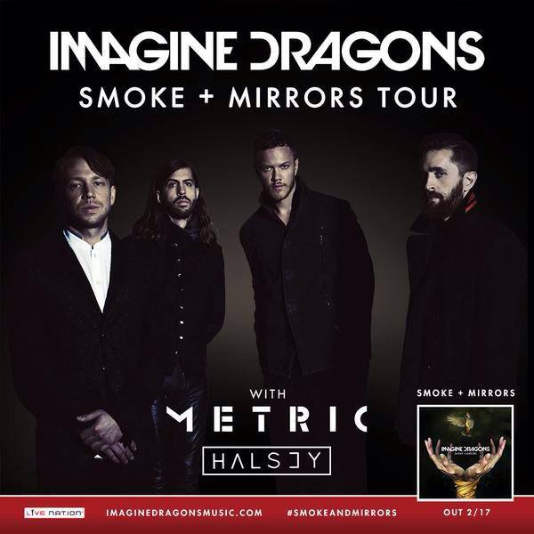 The alternative rock band, Imagine Dragons, has announced a North American tour, called the “Smoke & Mirrors Tour,” for this summer. They will be touring in support of their upcoming album, Smoke + Mirrors. Metric and Halsey will be joining the tour, as support. You can check out the dates, details and poster, after the break.