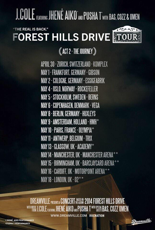 The hip hop artist, J. Cole, has announced the second leg of his “Forest Hills Drive Tour,” for this spring. The tour will be hitting cities across the UK and Europe. Jhené Aiko and Pusha T will be supporting on select dates, while Bas, Cozz and Omen will support on the entire tour. You can check out the dates, details and poster, after the break.
