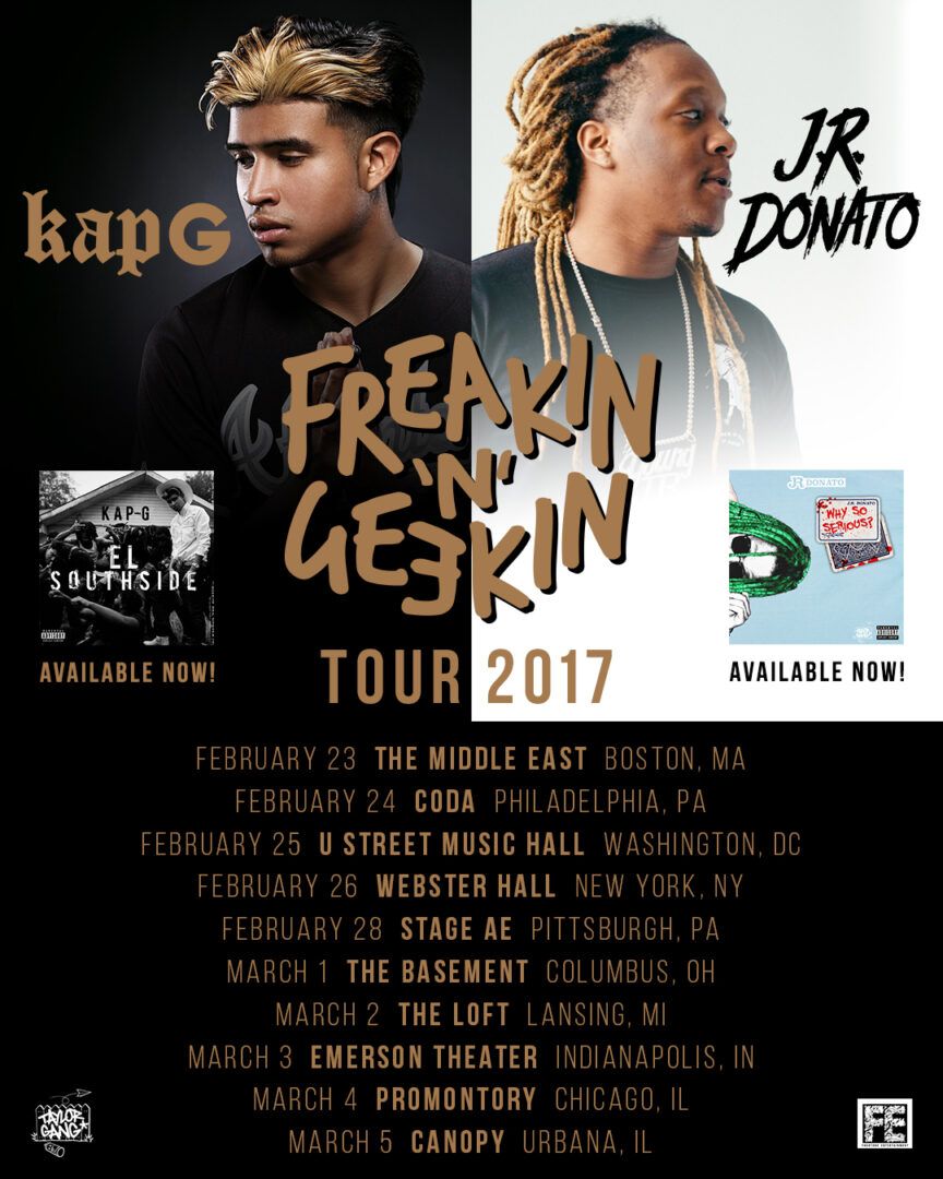 The rapper, Kap G, has announced a ten city co-headline U.S. tour with J.R. Donato, called the “Freakin ‘N’ Geekin Tour 2017,” for February and March. You can check out the dates, details and poster, after the break.