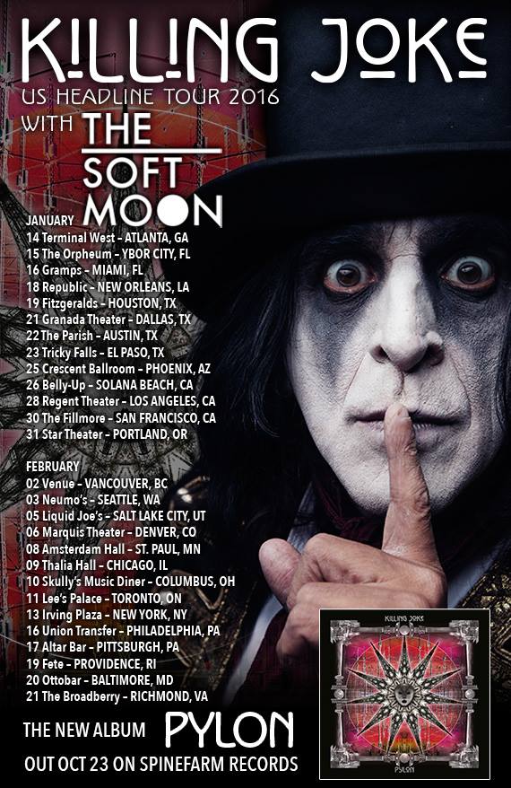 The rock band, Killing Joke, have announced a winter tour in the United States, to support their new album, Pylon. The Soft Moon will be supporting the tour. You can check out the dates, details and poster, after the break.