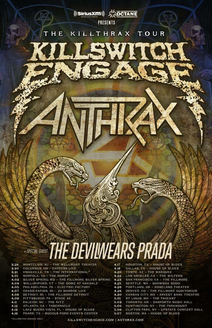 The metal band, Killswitch Engage, have announced the co-headline North American tour with Anthrax, called the “Killthrax Tour,” for March through May. The Devil Wears Prada will join the tour, as support. You can check out the dates, details and poster, after the break.