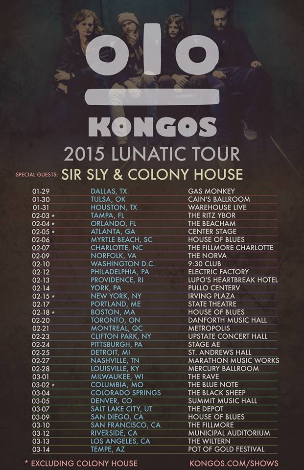 The rock band, Kongos, have announced a North American winter tour, called the “2015 Lunatic Tour.” They’ll be out with Sir Sly and Colony House, as support. You can check out the dates, details and poster, after the break.