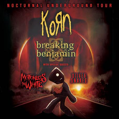 The metal band, Korn, has announced a co-headline U.S. tour with Breaking Benjamin, called the “Nocturnal Underground Tour,” for September and October. Motionless In White and Silver Snakes will be joining the tour, as support. You can check out the dates, details and poster, after the break.