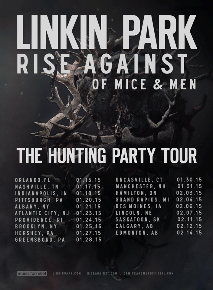 The rock band, Linkin Park, have announced a North American tour for winter 2015, called “The Hunting Tour.” Joining as support will be Rise Against and Of Mice and Men. You can check out the dates, details and poster, after the break.