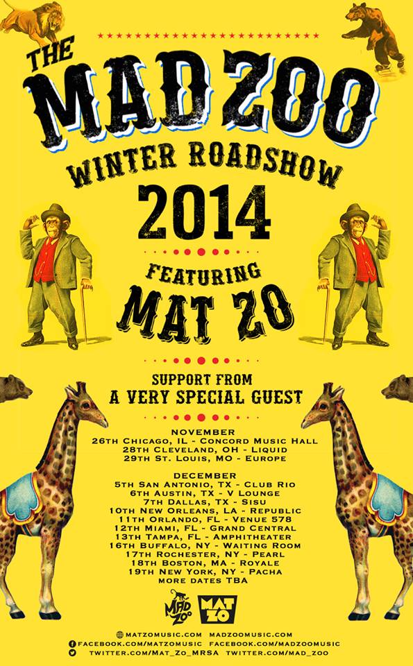 The electronic artist, Mat Zo, has announced the “Mad Zoo: Winter Roadshow Tour.” The tour will be hitting cities across the United States. You can check out the dates, details and poster, after the break.