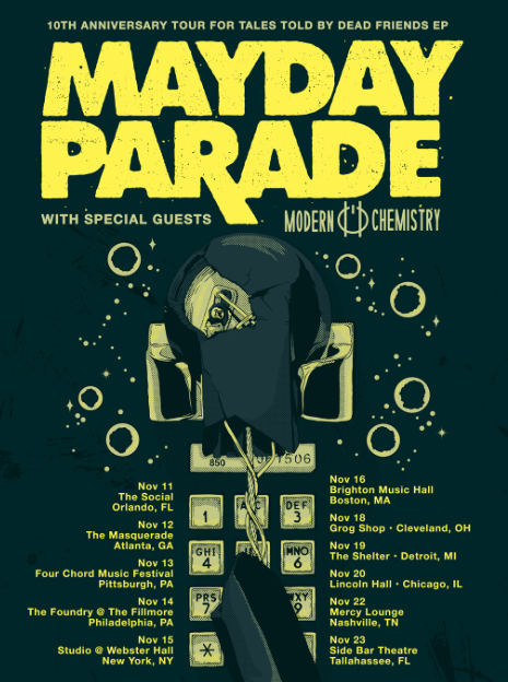 The pop rock band, Mayday Parade, have announced a fall U.S. tour, called the “10th Anniversary Tour for Tales Told By Dead Friends EP,” for November. The tour is in celebration of the 10 year anniversary of their debut EP, Tales Told By Dead Friends. Modern Chemistry will be joining the tour, as support. You can check out the dates, details and poster, after the break.