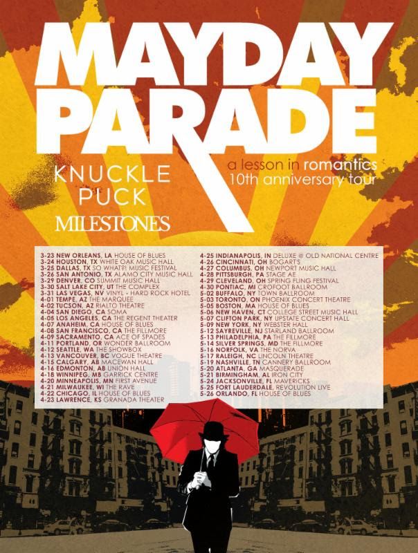 The pop rock band, Mayday Parade, has announced a North American tour, to celebrate the 10th anniversary of their debut full-length album, A Lesson In Romantics, for March through May. Knuckle Puck and Milestones will join the tour, as support. You can check out the dates, details and poster, after the break.