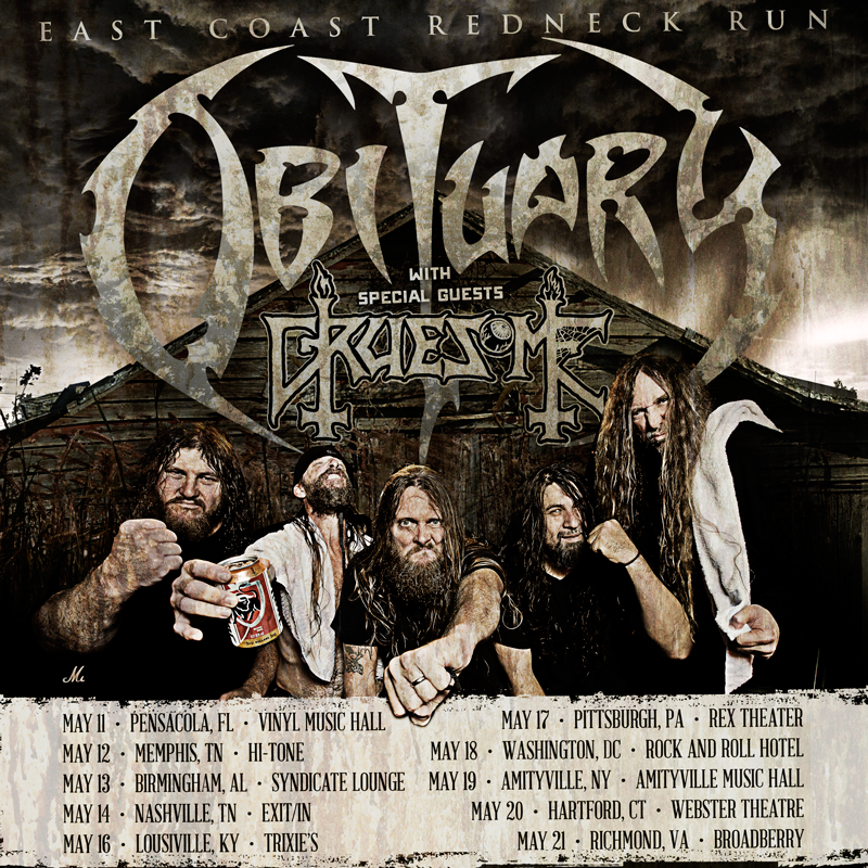The death metal band, Obituary, has announced a U.S. tour, called the “East Coast Redneck Run,” for May. This tour is in support of their recently released, self-titled album.