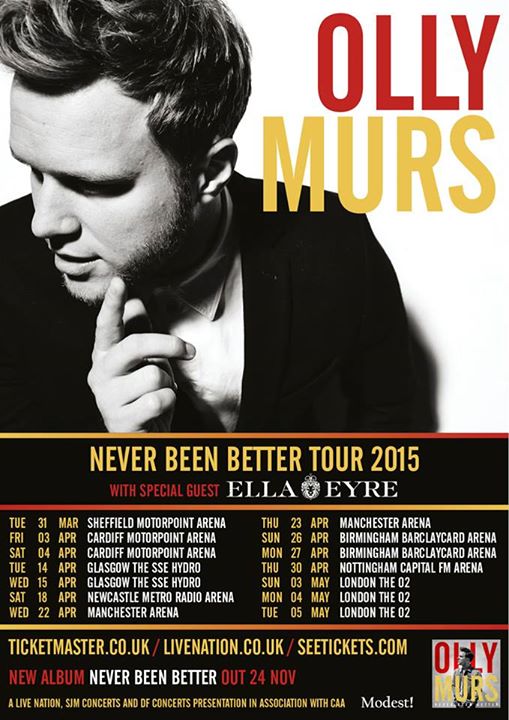 The pop artist, Olly Murs, has announced a European tour, for spring of 2015, called the “Never Been Better Tour.” Ella Eyre will be joining as support. You can check out the dates, details and poster, after the break.