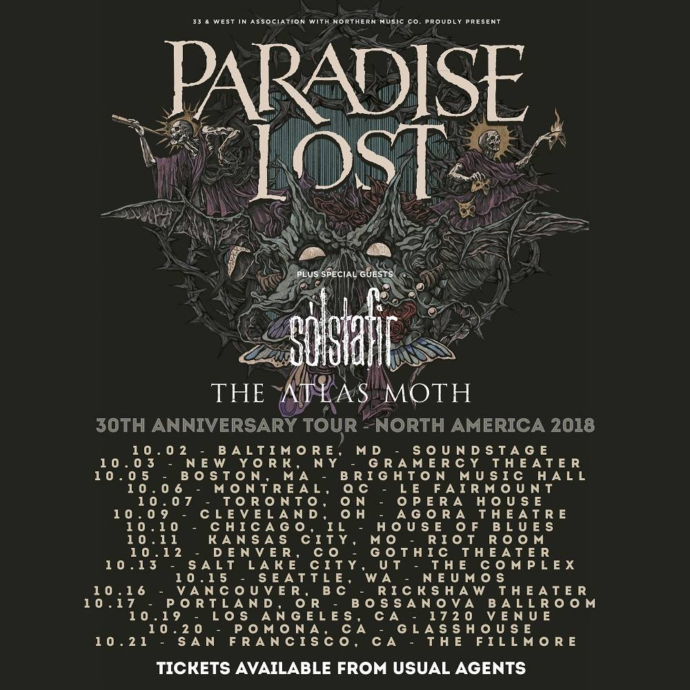 The doom metal band, Paradise Lost, has announced a U.S. headline tour, for October. They will be touring in support of their 2017 album, Medusa. Solstafir and The Atlas Moth will join the tour, as support.