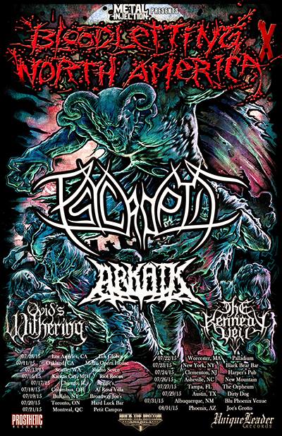 The metal band, Psycroptic, has announced a North American tour, called the “Bloodletting North America Tour,” for this summer. Arkaik, Ovid’s Withering and The Kennedy Veil will be joining the tour, as support. You can check out the dates, details and poster, after the break.