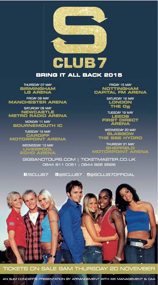 The pop band, S Club 7, has announced a reunion tour through the U.K., called the “Bring It All Back 2015 Tour,” for the spring. The tour will start on May 7 in Birmingham and will end on May 21 in Sheffield. You can check out the dates, details and poster, after the break.