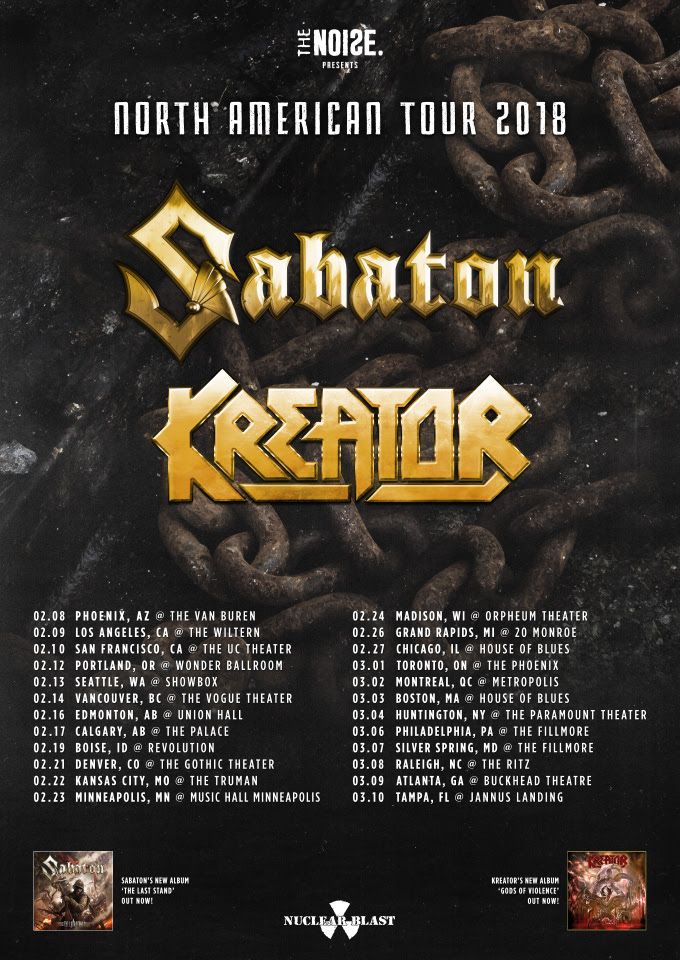 The power metal band, Sabaton, has announced a co-headline U.S tour with Kreator, for February and March. The band is touring in support of their latest album, The Last Stand. You can check out the dates, details and poster, after the break.