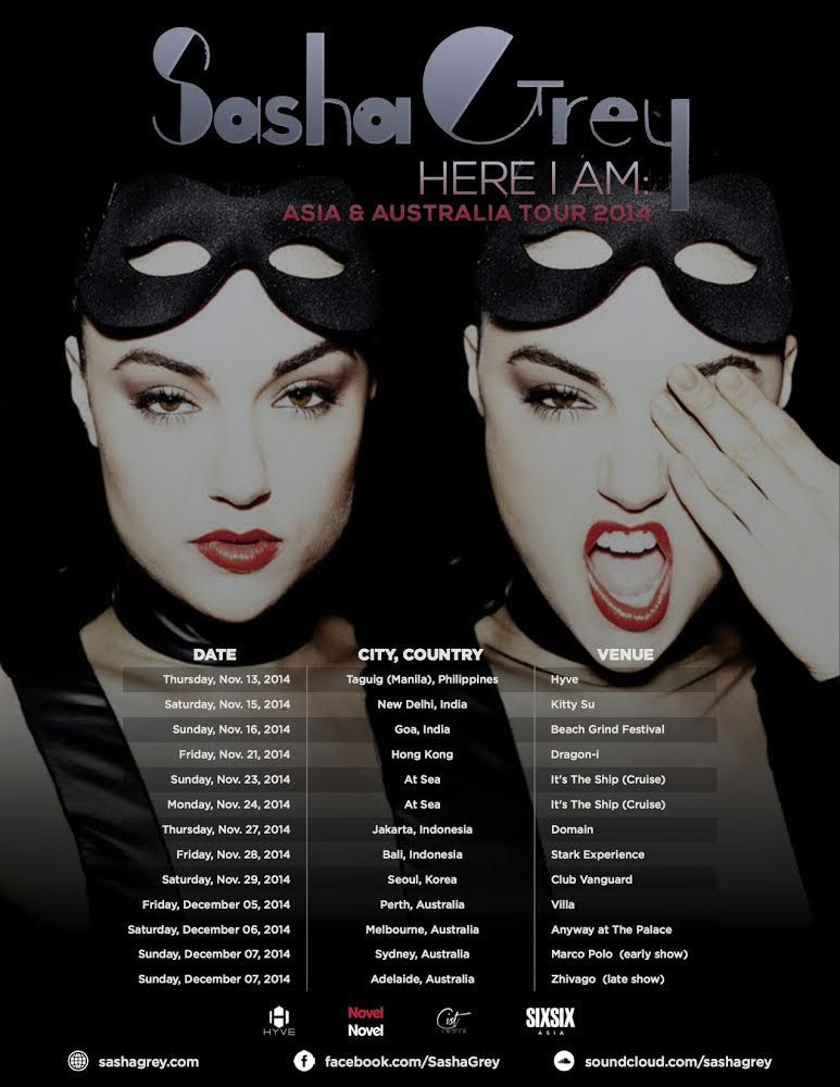 The dance music artist, Sasha Grey, has announced the “Here I Am Tour” for Asia and Australia, this fall. The tour will begin on November 13 in Taguig, Manila and coming to an end on December 7 in Adelaide, Australia. You can check out the dates, details and poster, after the break.
