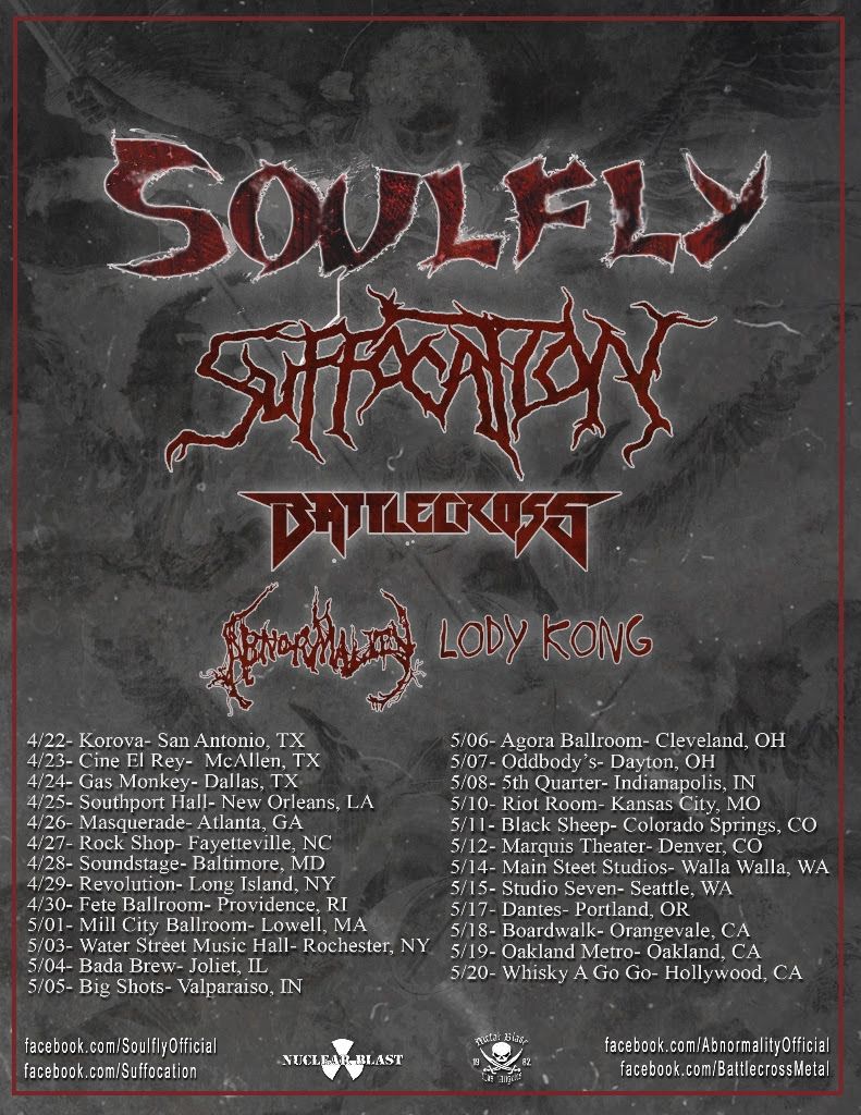The metal band, Soulfly, has announced a spring U.S. tour, for April and May. They will be touring in support of their latest album, Archangel. Suffocation, Battlecross, Abnormality and Lody Kong will be joining the tour, as support. You can check out the dates, details and poster, after the break.