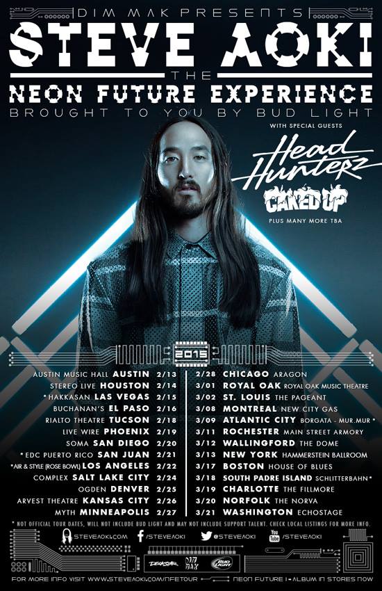 The electronic artist, Steve Aoki, has announced the “Neon Future Experience Tour” in the United States. Headhunterz and Caked Up will be joining as support. You can check out the dates, details and poster, after the break.