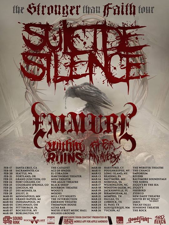 The metal band, Suicide Silence, have announced the “Stronger Than Faith Tour,” in the United States. Emmure, Within The Ruins and Fit For An Autopsy will be supporting the tour. You can check out the dates, details and poster, after the break.