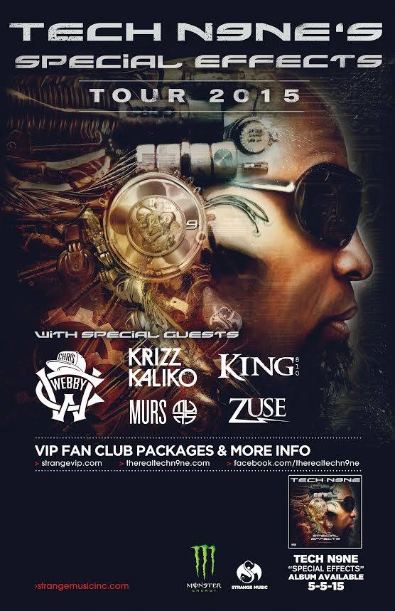 The hip hop artist, Tech N9ne, has announced a U.S. tour in support of his upcoming album, Special Effects, called the “Special Effects Tour.” Chris Webby, Krizz Kaliko, Murs, King 810 and Zuse. The dates for the tour will be announced in the coming weeks. You can check out the poster, after the break.