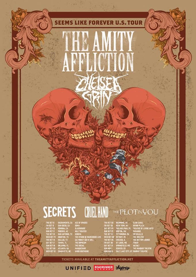 The post-hardcore band, The Amity Affliction, has announced a headlining U.S. tour, called the “Seems Like Forever Tour,” for this fall. Chelsea Grin, Secrets, Cruel Hand and The Plot In You will be joining the tour, as support. You can check out the dates, details and poster, after the break.