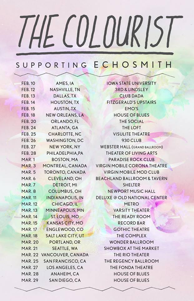 The indie pop quartet, The Colourist, have been added, as support, to Echosmith’s North American tour, for February and March. You can check out the dates, details and poster, after the break.