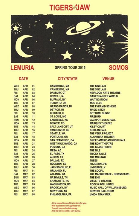 The indie rock band, Tigers Jaw, has announced a spring U.S. tour, with dates set for April and May. They’re being supported by Lemuria and SoMos, on this tour. You can check out the dates, details, and poster, after the break.