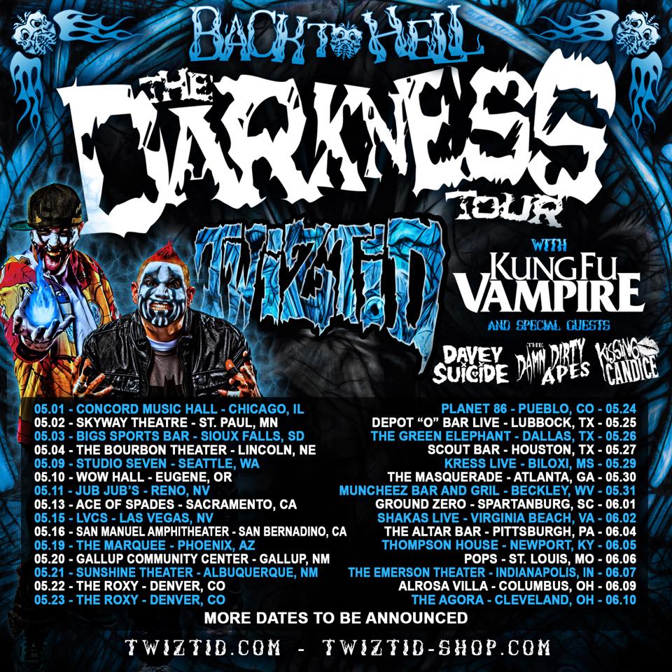 The hip-hop duo, Twiztid, has announced the dates for their U.S. tour, called “The Back To Hell Tour,” for this spring. They will be touring in support of their new album, The Darkness. Kung Fu Vampire, Davey Suicide, The Damn…